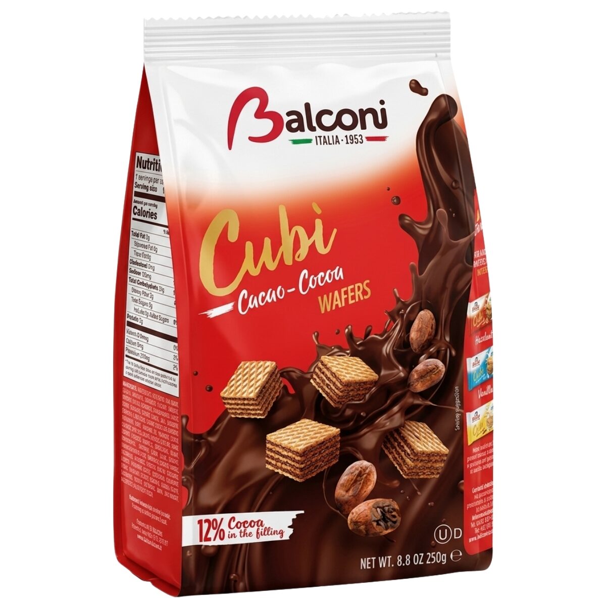 Napolitane Balconi Cubi cu Umplutura de cacao, 250 g