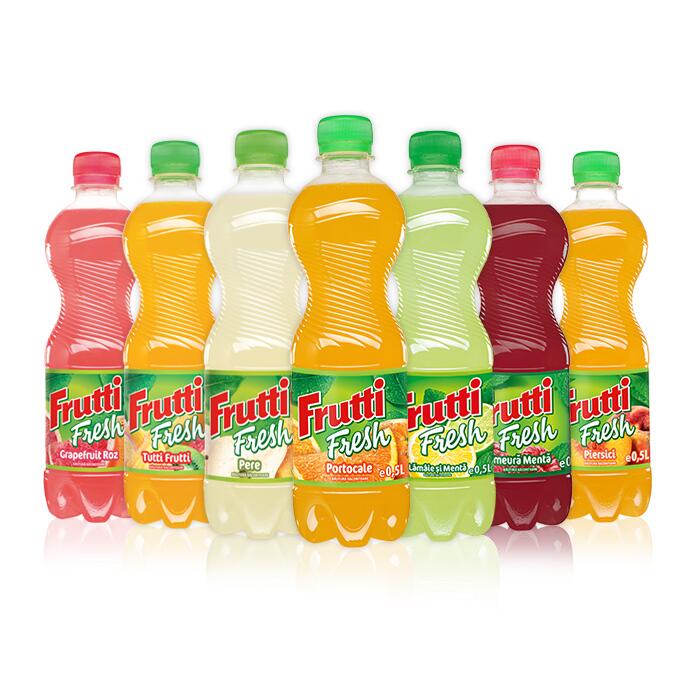 Delicios sau revigorant? Tânăr sau efervescent? Asta-i întrebarea! Un pahar de Frutti Fresh ţi le poate aduce pe toate! Împreună cu gustul inconfundabil al fructelor: portocale, grapefruit-roz, zmeură și mentă, lămâie și mentă, piersici, pere, precum şi o combinaţie irezistibilă, un cocktail de fructe exotice – inconfundabilul Tutti Frutti. Acum ai Frutti Fresh, mai tânăr, mai efervescent!