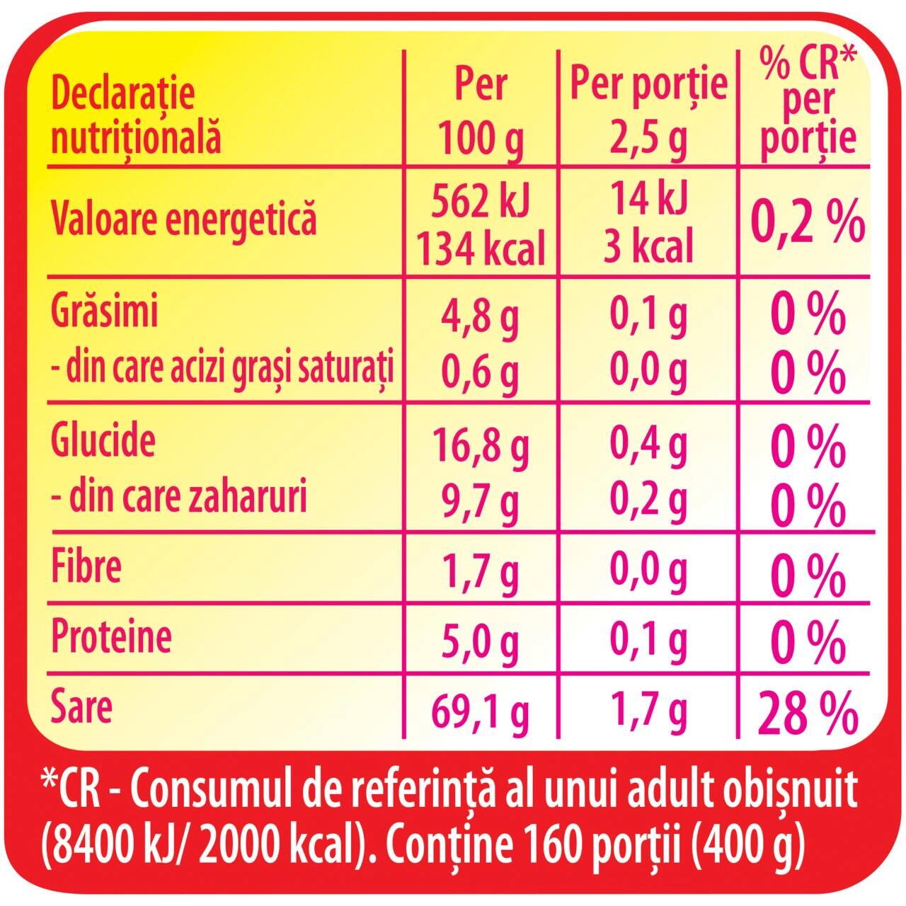 Ingrediente:sare iodata, potentiatiori de aroma (monoglutamat de sodiu, 5’-ribonucleotide disodice), zahar, legume deshidratate (4,5%) in proportii variabile (morcovi, frunze de patrunjel, ceapa, frunze de telina, ardei gras rosu), ulei vegetal de floarea soarelui, arome, amidon din porumb, condimente (turmeric, piper negru), grasime de gaina (0,4%) cu antioxidant (extract de rozmarin), carne deshidratata de gaina (0,1%) cu adaos de sare si antioxidant (extract de rozmarin), colorant (riboflavina).Poate contine ou, peste, gluten, lapte si soia.
