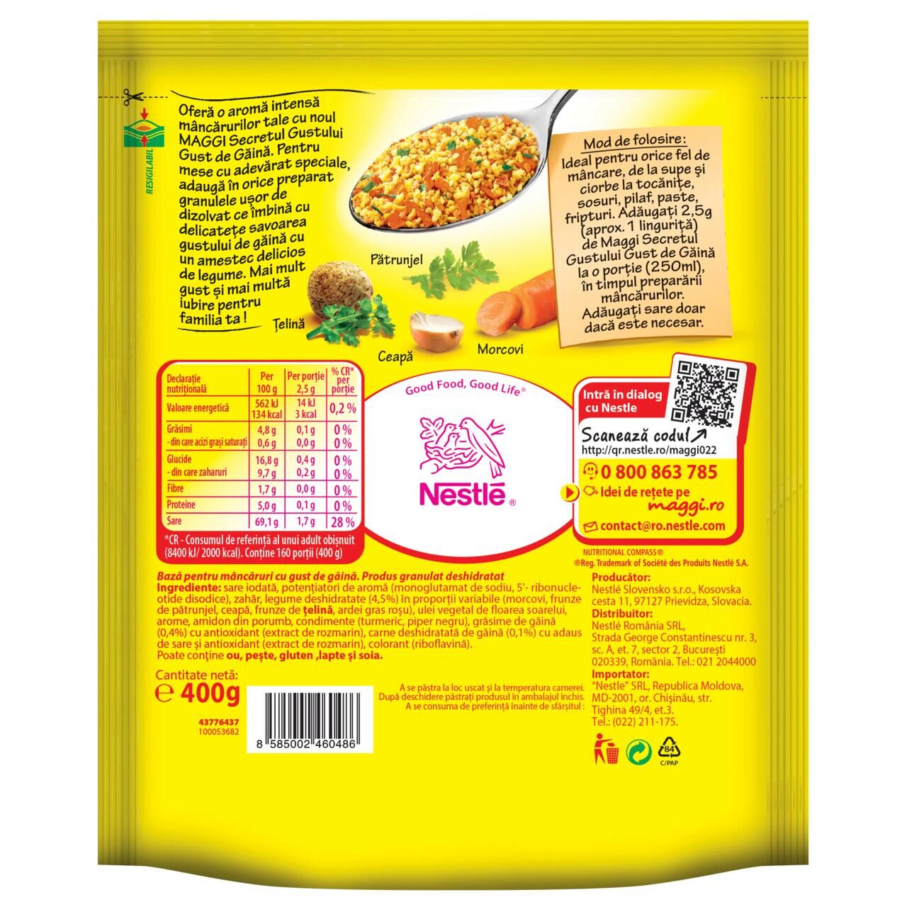 Instructiuni de utilizare/preparare:Adaugati 2,5g (aprox. 1 lingurita) de MAGGI Secretul Gustului Gaina la o portie (250ml) in timpul prepararii mancarurilor. Adaugati sare doar daca este necesar.