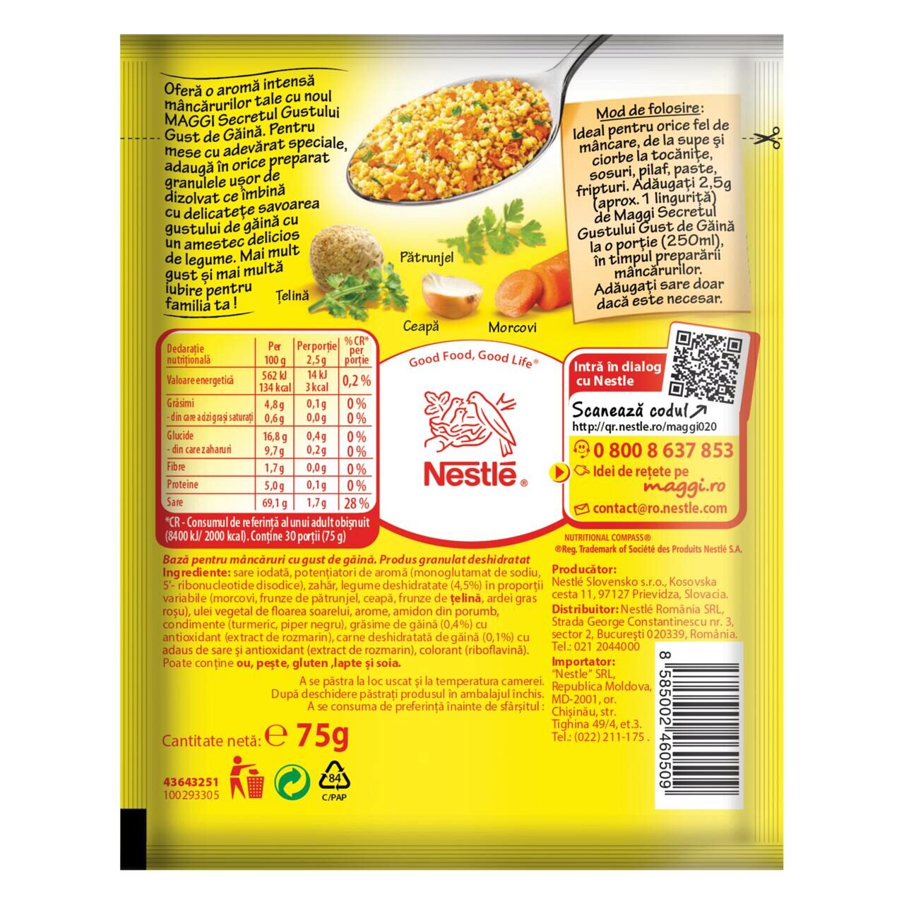 Instructiuni de utilizare/preparare:Adaugati 2,5g (aprox. 1 lingurita) de MAGGI Secretul Gustului Gaina la o portie (250ml) in timpul prepararii mancarurilor. Adaugati sare doar daca este necesar.