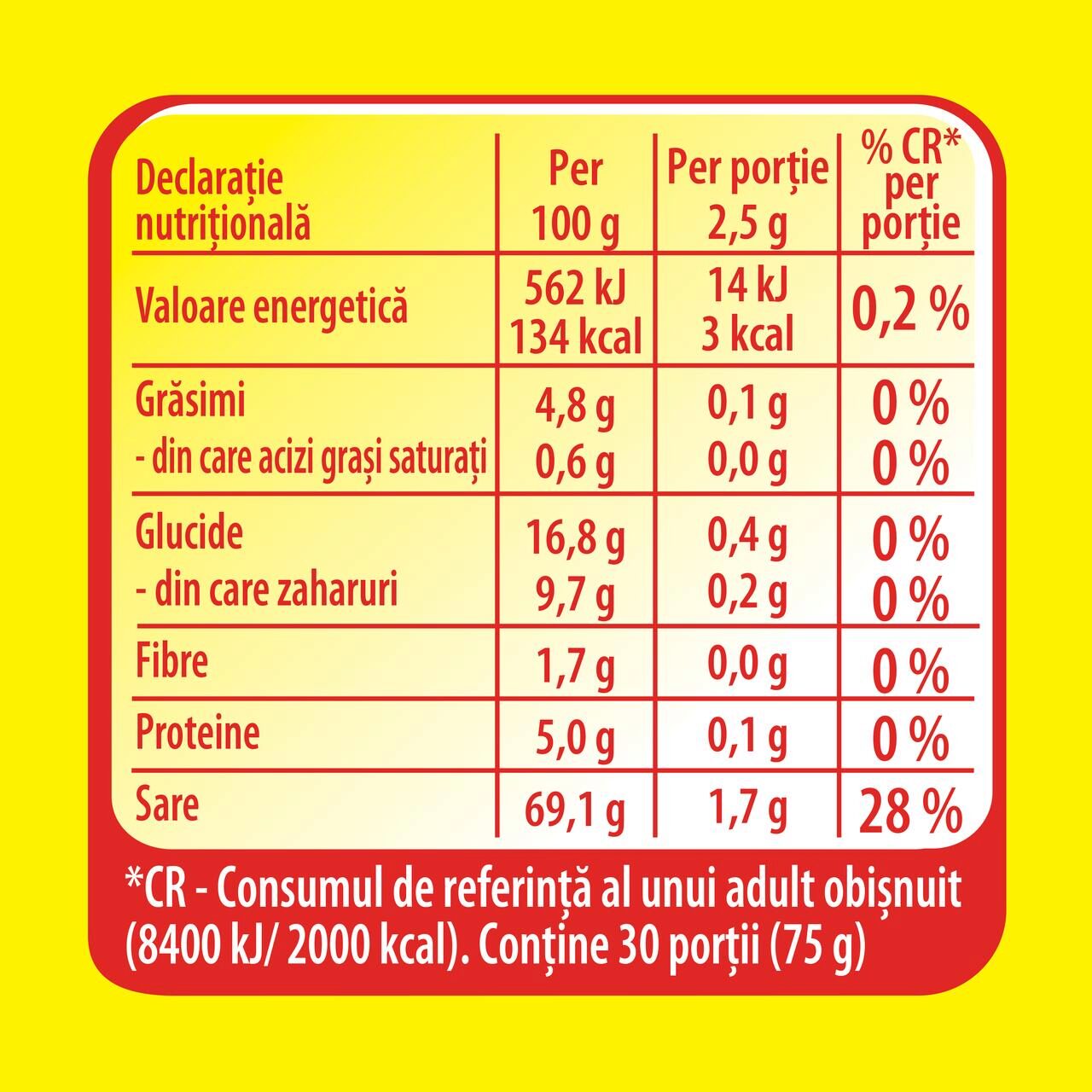 Ingrediente:sare iodata, potentiatiori de aroma (monoglutamat de sodiu, 5’-ribonucleotide disodice), zahar, legume deshidratate (4,5%) in proportii variabile (morcovi, frunze de patrunjel, ceapa, frunze de telina, ardei gras rosu), ulei vegetal de floarea soarelui, arome, amidon din porumb, condimente (turmeric, piper negru), grasime de gaina (0,4%) cu antioxidant (extract de rozmarin), carne deshidratata de gaina (0,1%) cu adaos de sare si antioxidant (extract de rozmarin), colorant (riboflavina).Poate contine ou, peste, gluten, lapte si soia.