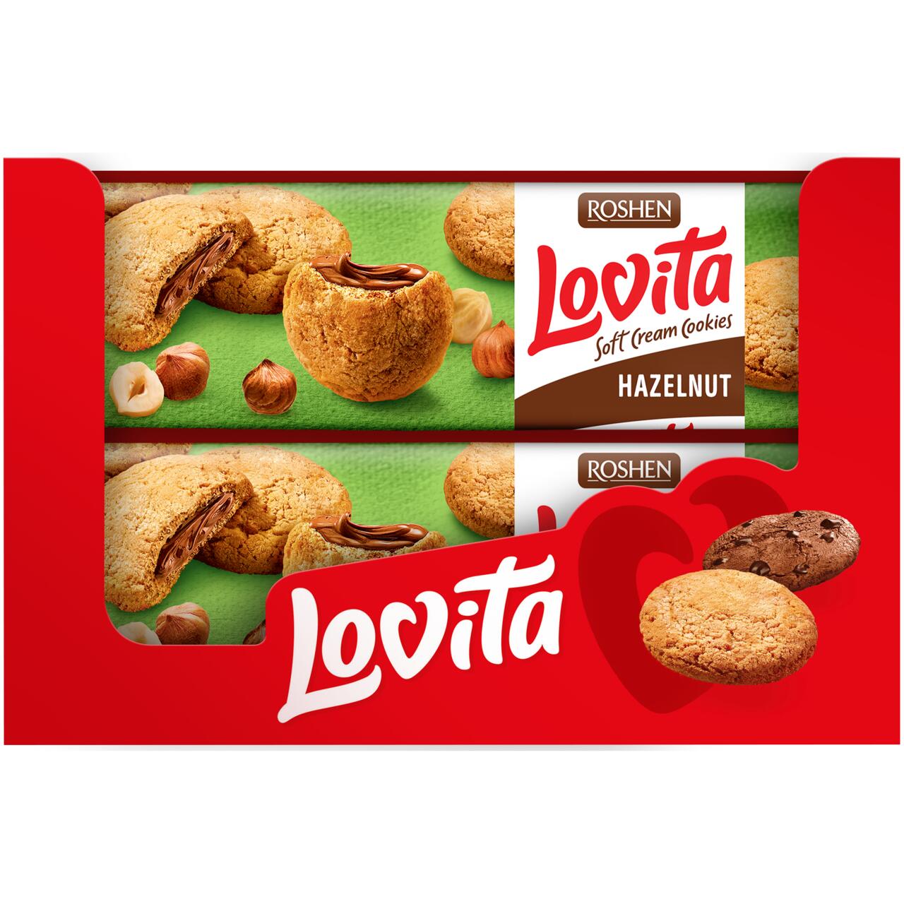 Zahar, faina de grau c/s, grasimi vegetale (ulei de palmier nehidrogenat) ulei de floarea- soarelui, pudra de cacao cu continut scazut de grasimi, alune de padure prajite si rase 6,6% ( in umplutura), amidon de porumb, faina de ovaz, lapte praf degrasat, galbenus de ou, agenti de afanare (bicarbonat de sodiu, dihidrat pirofosfat de sodiu), lactoza, praf de oua, emulsifiant de soia, sare, arome, regulator de aciditate acid lactic. Umplutura - 30%. Poate contine urme de arahide, migdale, seminte de susan.