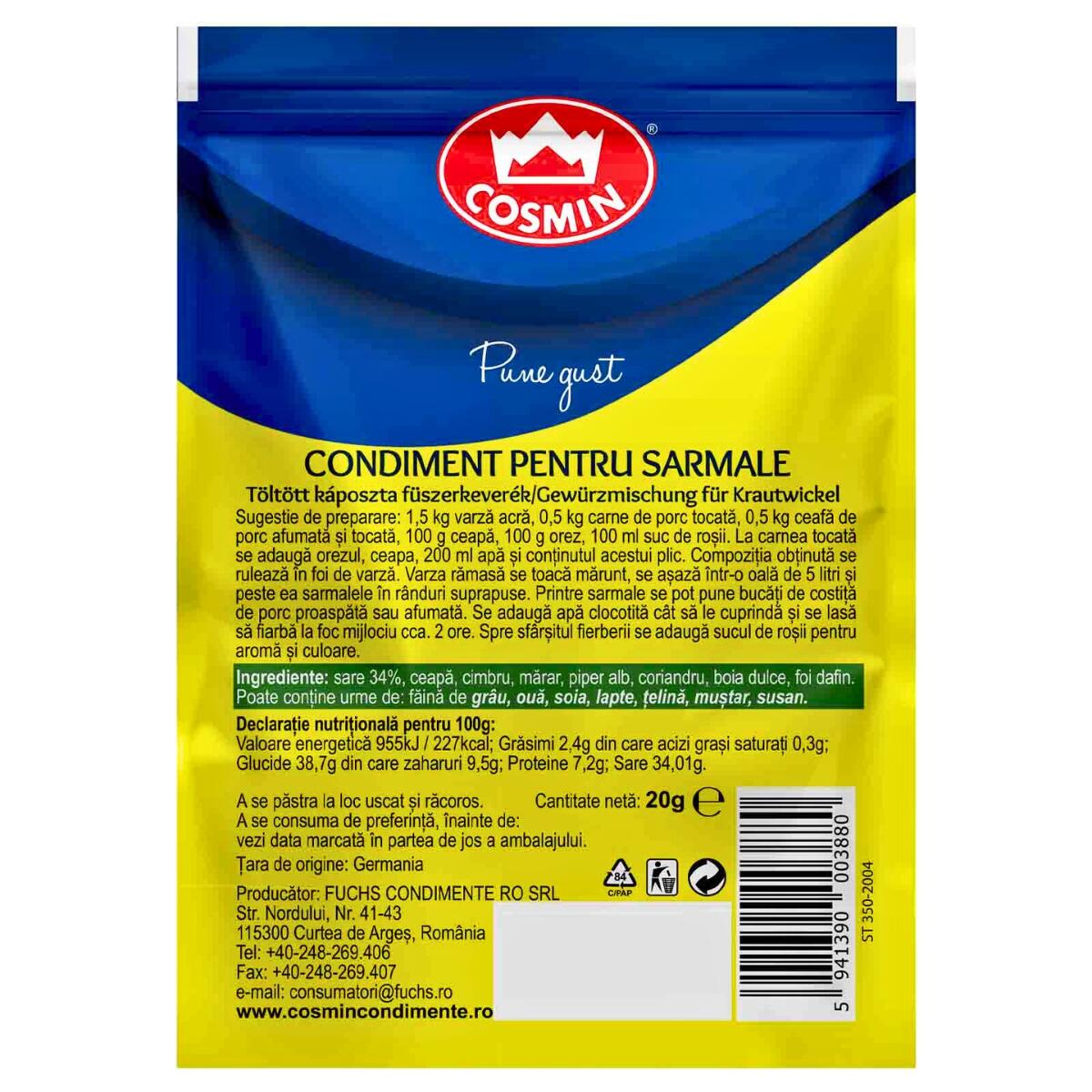 Sarmalele sunt un preparat clasic iubit de toată lumea, iar condimentul pentru sarmale de la Cosmin, realizat din ingrediente naturale, conține un amestec de mirodenii și verdețuri care aduc un gust autentic și delicios. Acesta transformă fiecare porție de sarmale într-o adevărată savoare, perfectă pentru a fi savurată alături de cei dragi.