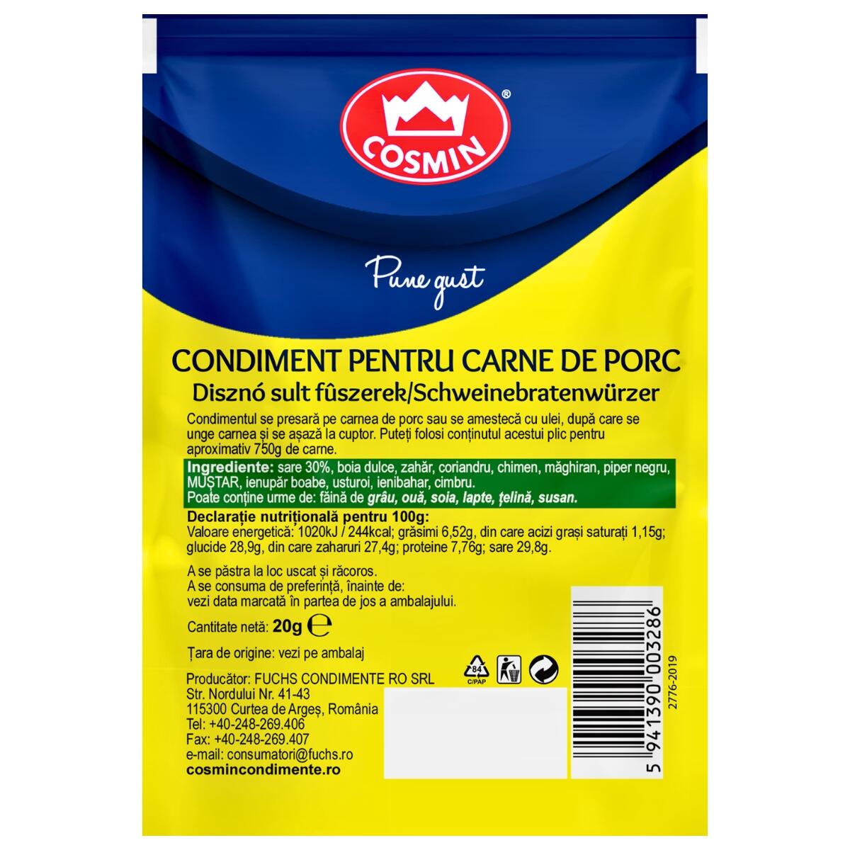 Condimentul pentru carne de porc de la Cosmin se presară pe carnea de porc sau se amestecă cu ulei, după care se unge carnea și se așază la cuptor. Amestecul conține doar ingrediente naturale, și garantează preparate delicioase, indiferent de ce rețetă pregătești. Puteți folosi conținutul acestui plic pentru aproximativ 750g de carne.