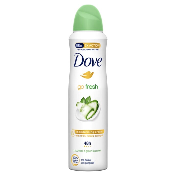 Cu un parfum racoritor, antiperspirantul spray Dove GoFresh Cucumber & Green Tea va protejeaza de la prima utilizare.Gratie protectiei eficiente de pana la 48 de ore impotriva transpiratiei, acest produs ofera un plus de incredere si o senzatie de confort intreaga zi.