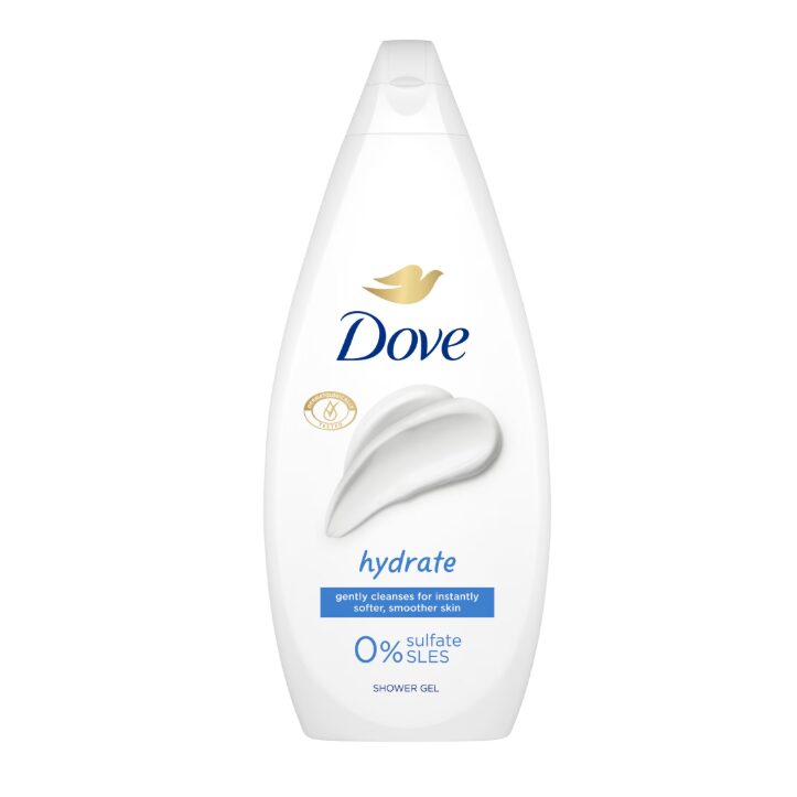 - Gelul de dus Dove Hydrate cu 0% sulfati SLES curata delicat pielea fara a-i afecta nivelul natural de hidratare si o lasa fina si catifelata chiar de la primul dus.
