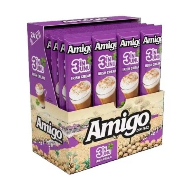 Irish Cream 3 in 1 Amigo, 24 x 13 g – o bautura instant cu aroma fina de Irish Cream, potrivita pentru momentele in care vrei ceva mai special. Combinatia dintre cafea solubila, zahar, lapte praf si aroma distinctiva de Irish Cream creeaza o experienta placuta si echilibrata, fara a contine alcool.
