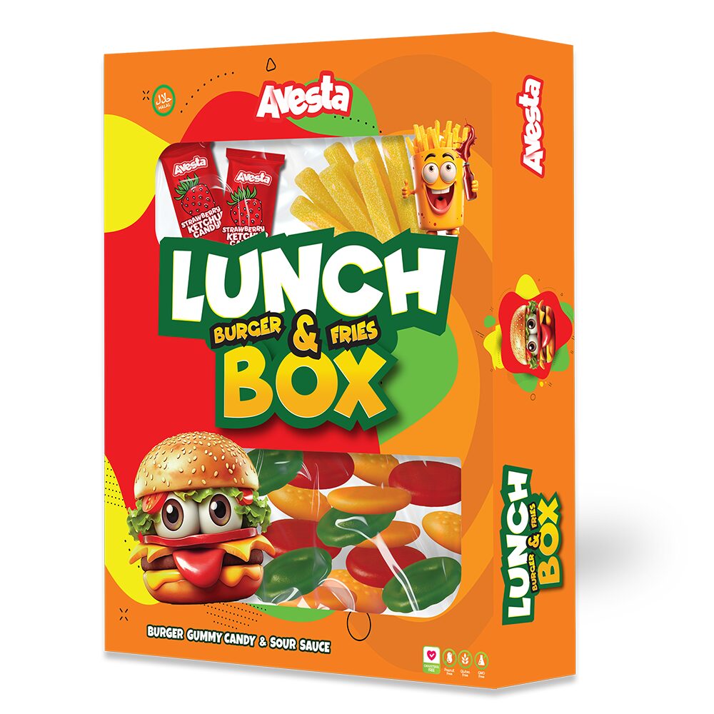 Bucură-te de Lunch Box Burger, cu burger gummy, cartofi prăjiți din jeleu și pachețele de sos acrișor pentru momente de gust distractive.