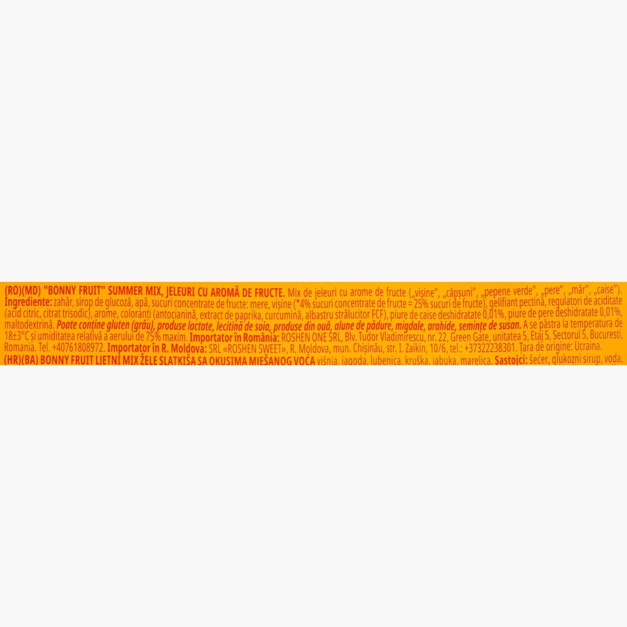 Roshen Bonny Fruit Summer Mix este un sortiment delicios de jeleuri fructate pe bază de pectină, create special pentru a aduce aromele verii mai aproape de tine. Îmbogățite cu 25% suc natural din fructe tropicale precum piersică, mango, ananas și pepene galben, aceste jeleuri oferă un gust autentic și revigorant, ideal pentru toate vârstele.