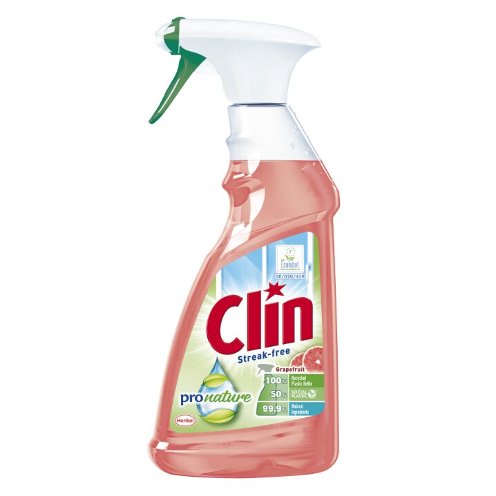 Spray-ul pentru curatarea geamurilor Clin Pro Nature este certificat de organizatia de certificare EU Ecolabel. EU Ecolabel garanteaza ca produsele de curatare cumparate cu eticheta au un impact redus asupra mediului. Sticlele reutilizabile de spray sunt fabricate din 100% plastic reciclat Social Plastic, colectat de localnici de pe terenuri si plaje din tari fara infrastructura adecvata de eliminare a deseurilor. Clin Pro Nature a incheiat un parteneriat cu Plastic Bank, care stabileste standarde inalte pentru produsele ecologice, pentru a reutiliza plasticul colectat din natura pentru sticlele Clin Pro Nature.