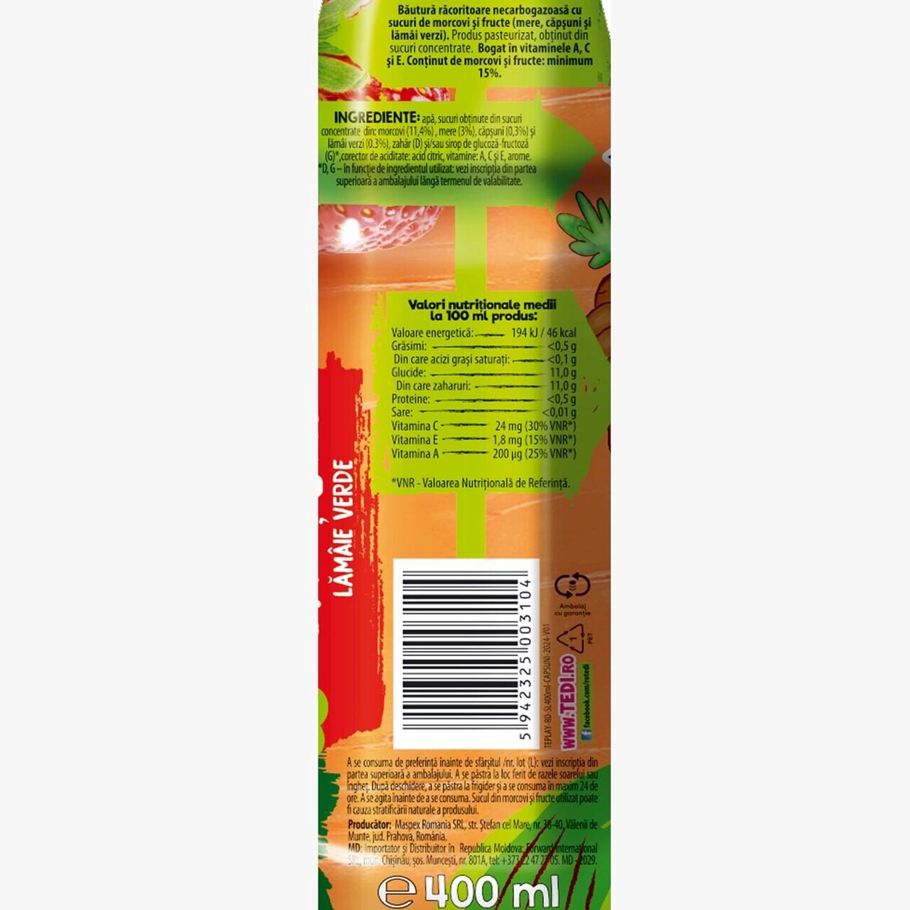 Suc Tedi Play Morcov, Zmeură și Lămâie – Gust vesel, plin de vitamine!, 400 ml